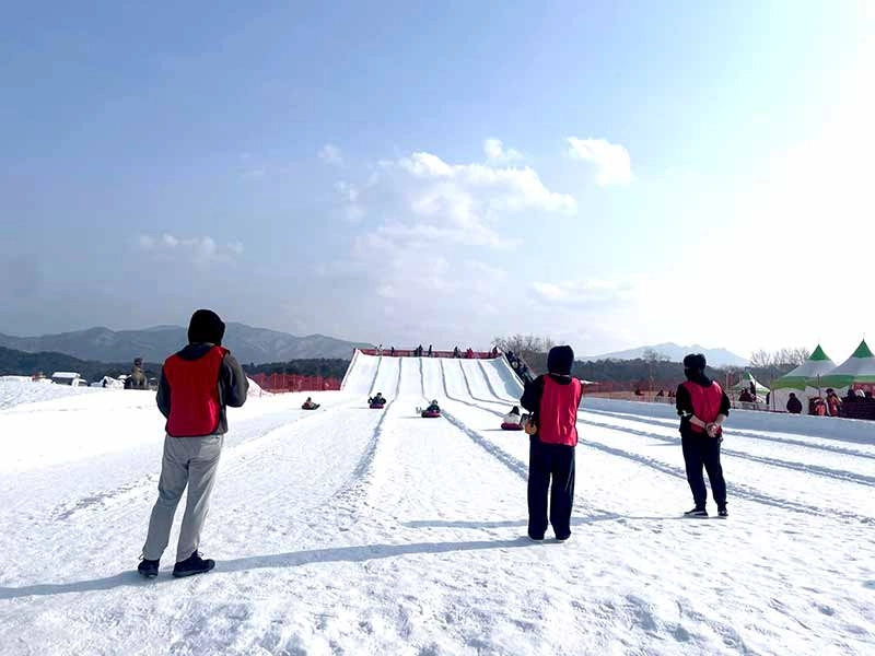 snow-sledding with sack, top-spinning games and human curling games.