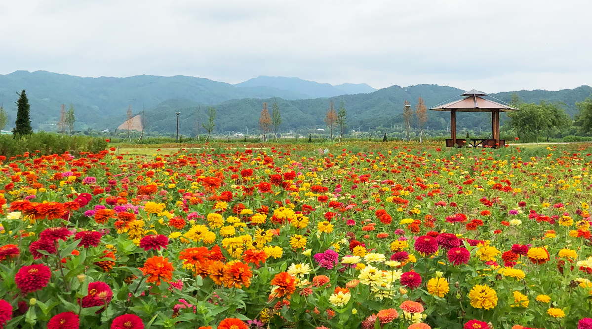 You can see rape flowers and azaleas in warm spring, poppies, and roses in summer when the sun shines, and crape myrtle, cosmos, buckwheat flowers, and sunflowers in contrast to the sky blue in autumn when the sky is blue. And in early winter, silver grass is spreading on the road. It is a place that welcomes us on a flower path no matter what season we visit.