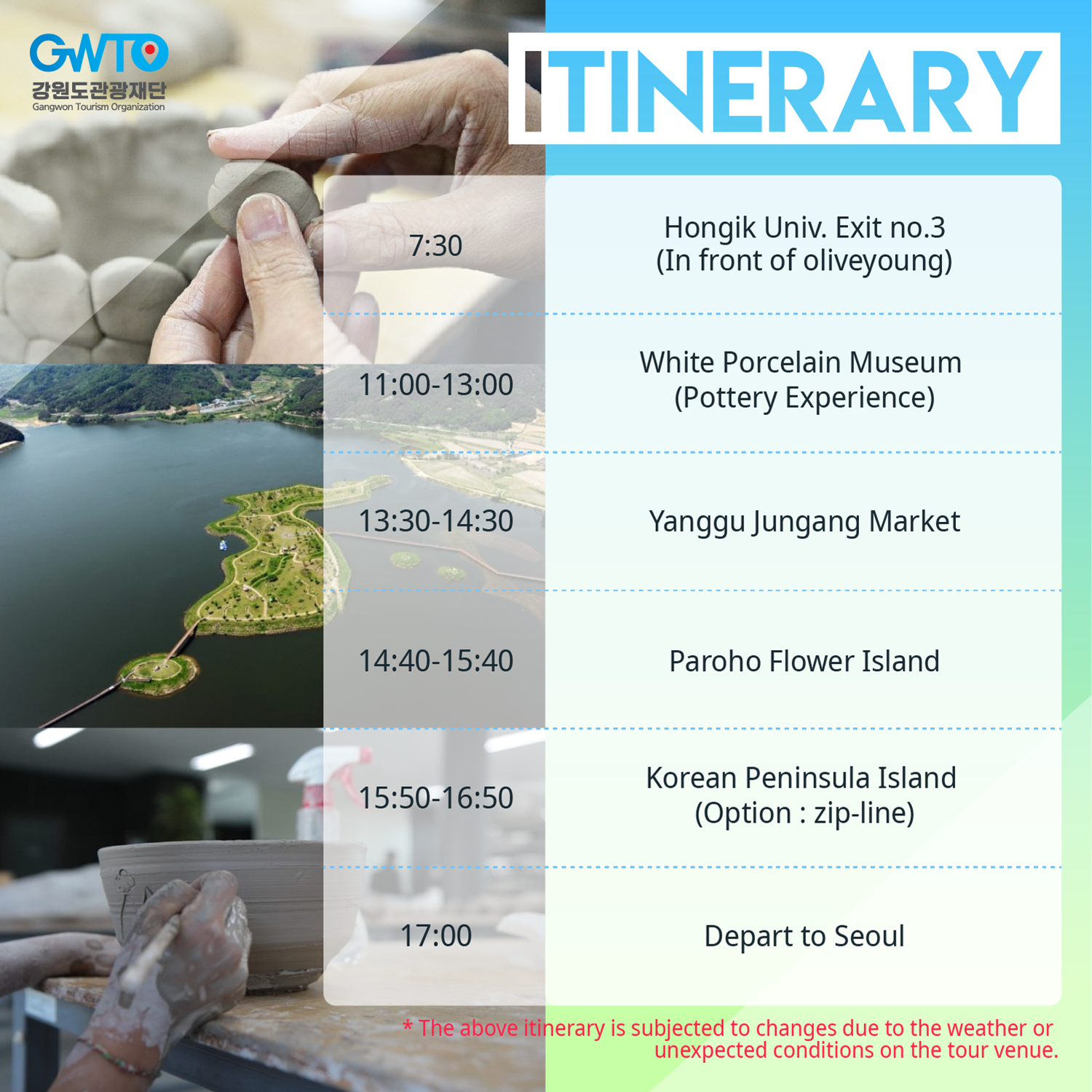 Yanggu Korean Peninsula Island is the largest artificial wetland in Korea located upstream of Lake Paro. Also optional Zip line is available for those who wants to try a zipline.